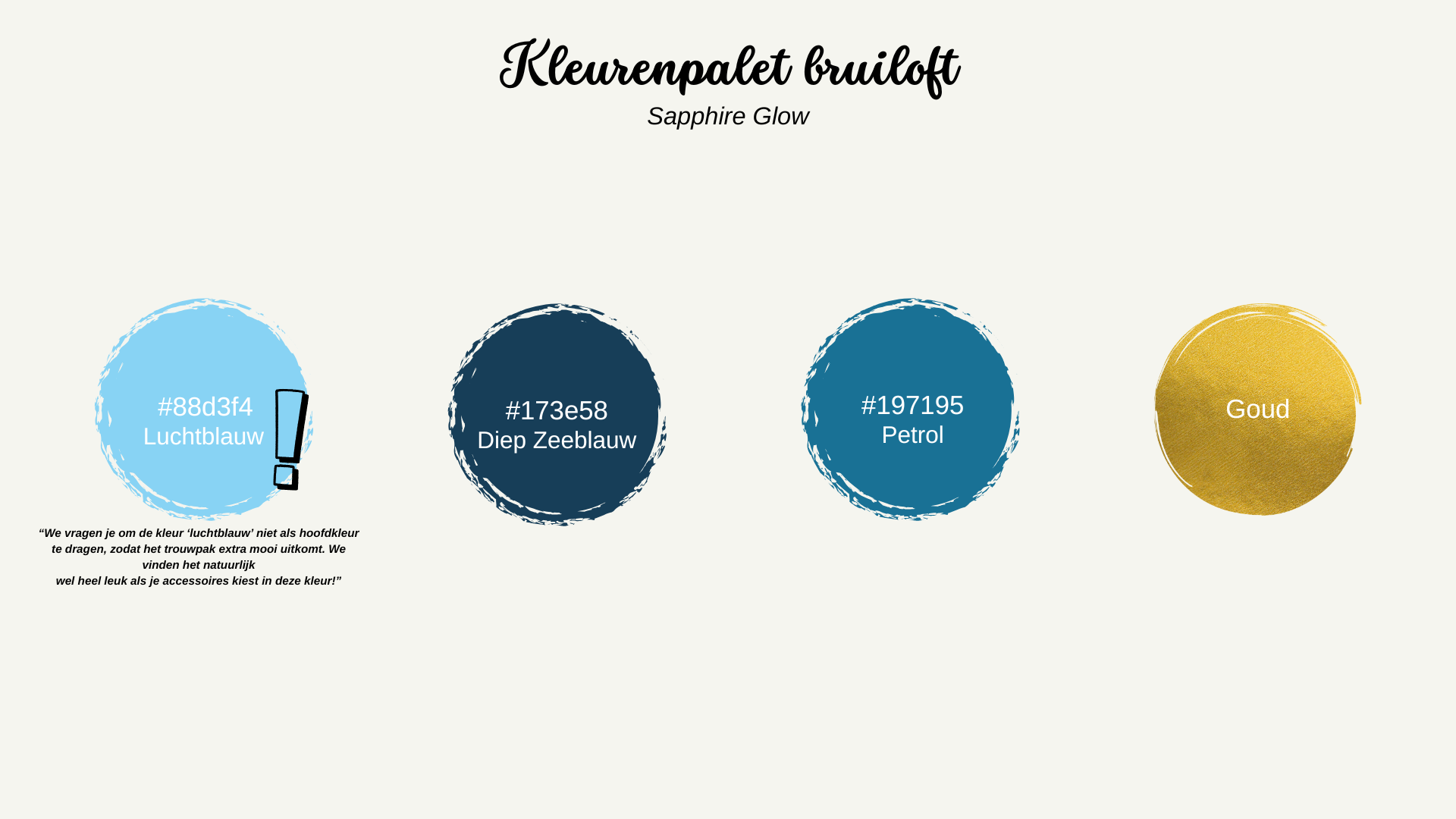 We vragen je de kleur 'luchtblauw' niet als hoofdkleur te dragen, zodat het trouwpak extra mooi uitkomt