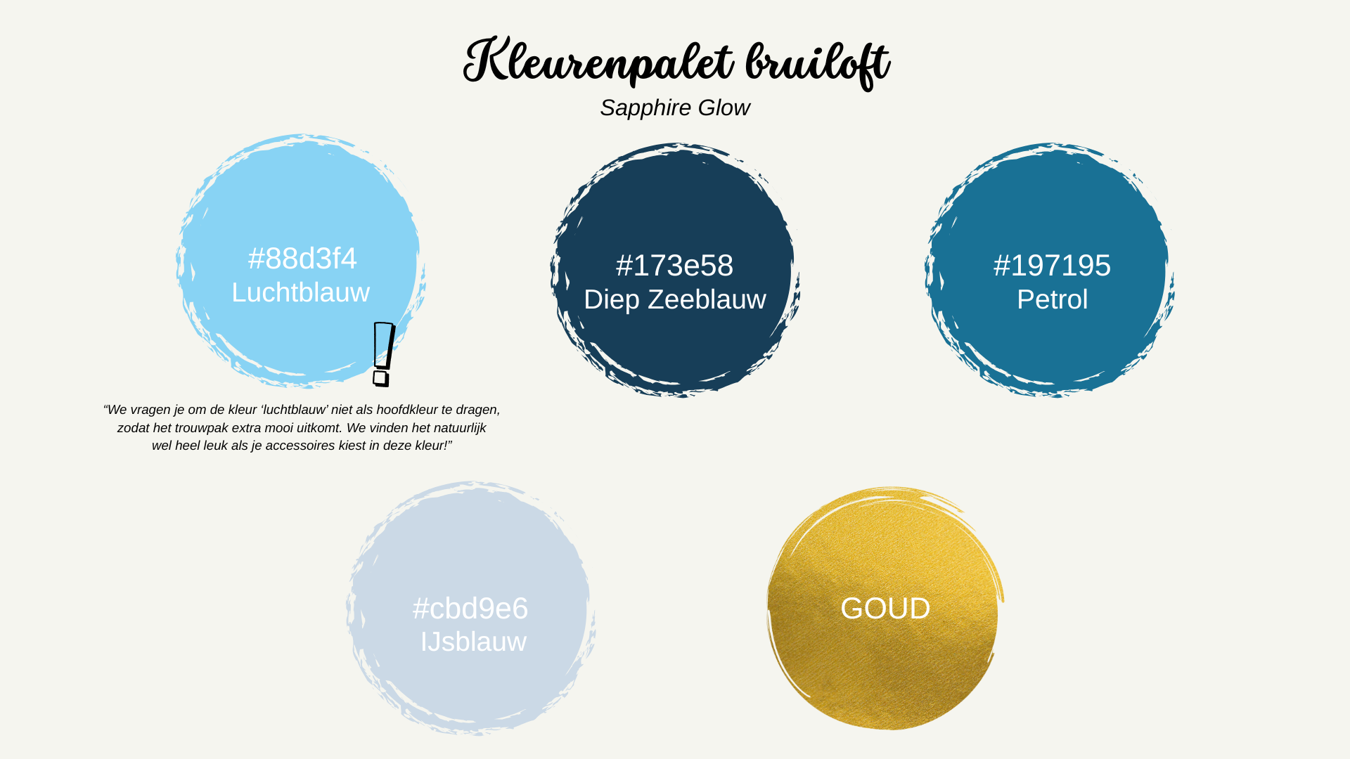 Om je een beetje op weg te helpen, hebben we een lijstje gemaakt met mooie, goed bij elkaar passende kleuren die het thema van onze dag versterken. We willen je vragen om de kleur luchtblauw niet als hoofdkleur voor je outfit te kiezen, zodat het trouwpak mooi kan blijven stralen. Accessoires in deze kleur zijn natuurlijk wél heel welkom en zien we graag terug! Hier vind je nog meer tips!