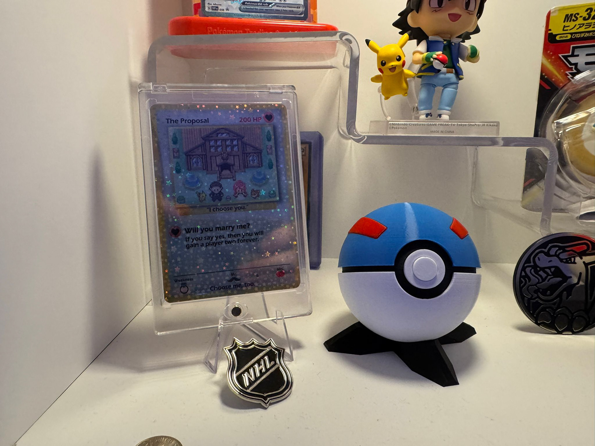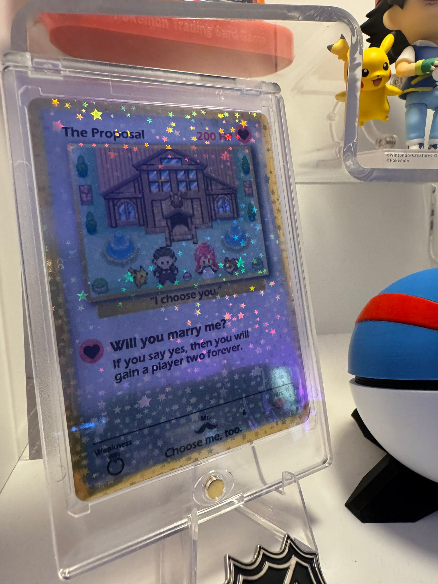 Na de wedstrijd was Dennis al een zenuwachtige drol en hij liep maar te treuzelen, maar net op het moment dat er een lichte vorm van besef kwam bij Jennifer, ging hij dan eindelijk op een knie. Met een Pokéball met ring en een Pokémon kaart, of ik voor altijd zijn 'player two' wil zijn. En daar riep ik natuurlijk volmondig JA! op.