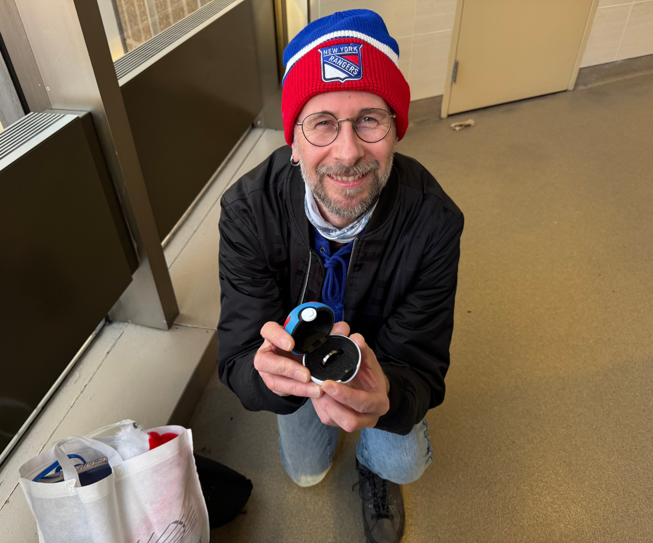 Je zal het maar bedenken: eerst naar een ijshockey wedstrijd van de New York Rangers in hun thuisbasis Madison Square Garden in NYC en daarna op één knie gaan. Met een Pokéball met ring op zak, was Dennis druk bezig zijn zenuwen te onderdrukken tijdens een spannende hockeywedstrijd.